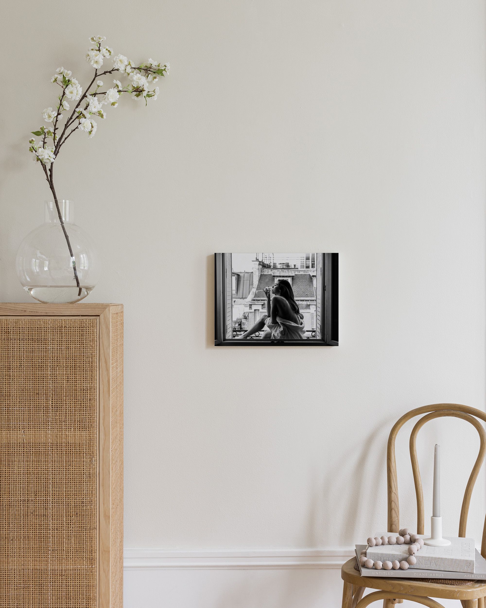 Una fotografía en blanco y negro de una persona sentada en una ventana con una toalla, mirando la ciudad. Los tonos grises crean una atmósfera tranquila y relajada.