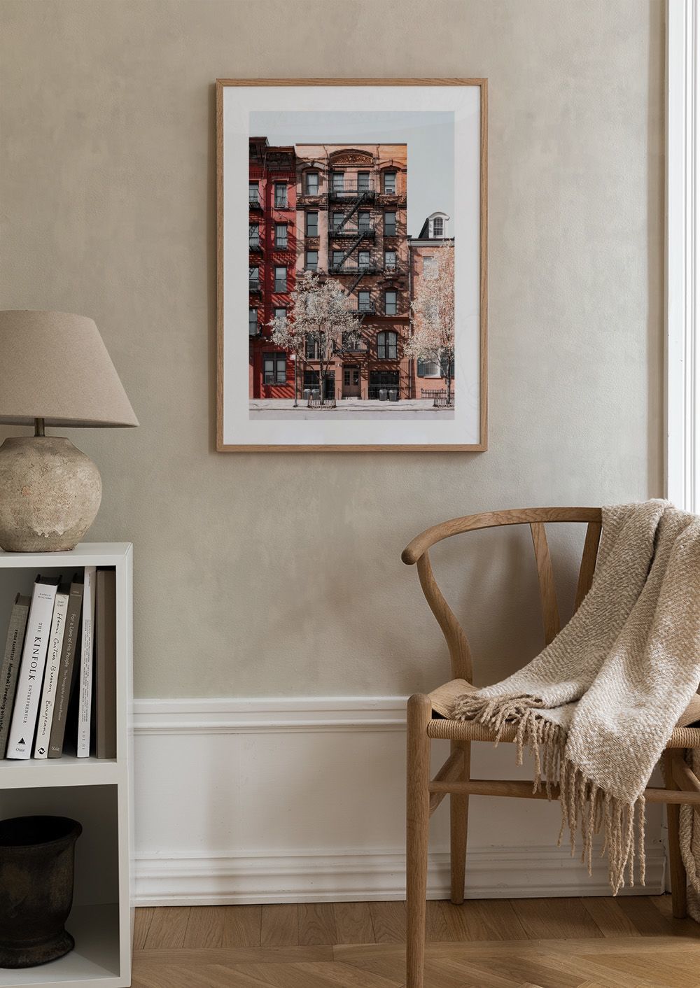 Un póster de edificios de ladrillo en Nueva York con escaleras de incendios. Los árboles con flores rosas crean un bonito contraste con el cielo azul y los tonos rojos de los edificios.