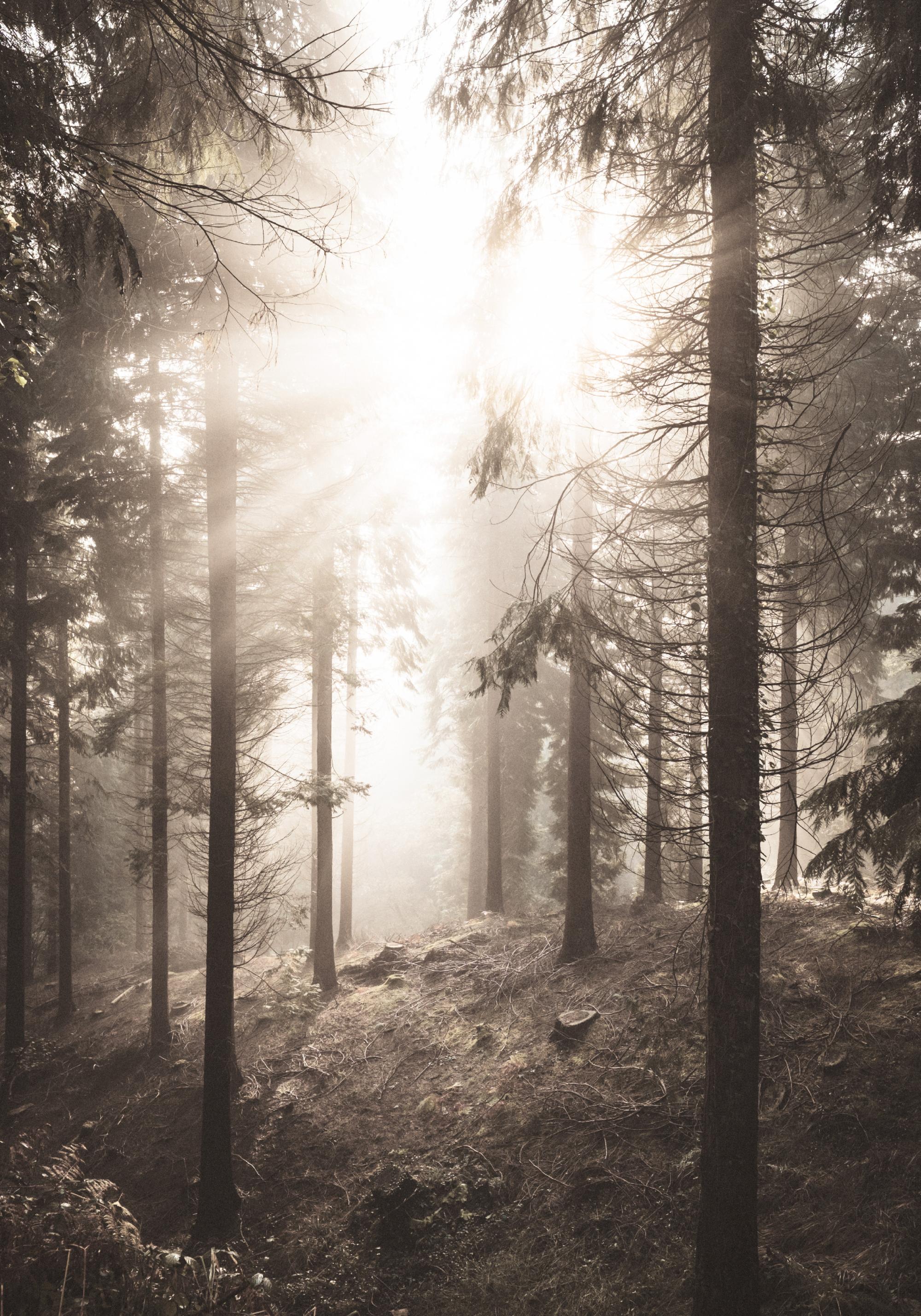 Un póster de naturaleza encantador de un bosque con la luz del sol brillando a través de los árboles que hace que el bosque brille. Crea un oasis de bienestar en tu hogar con nuestros pósters de paisajes y recarga tus baterías.