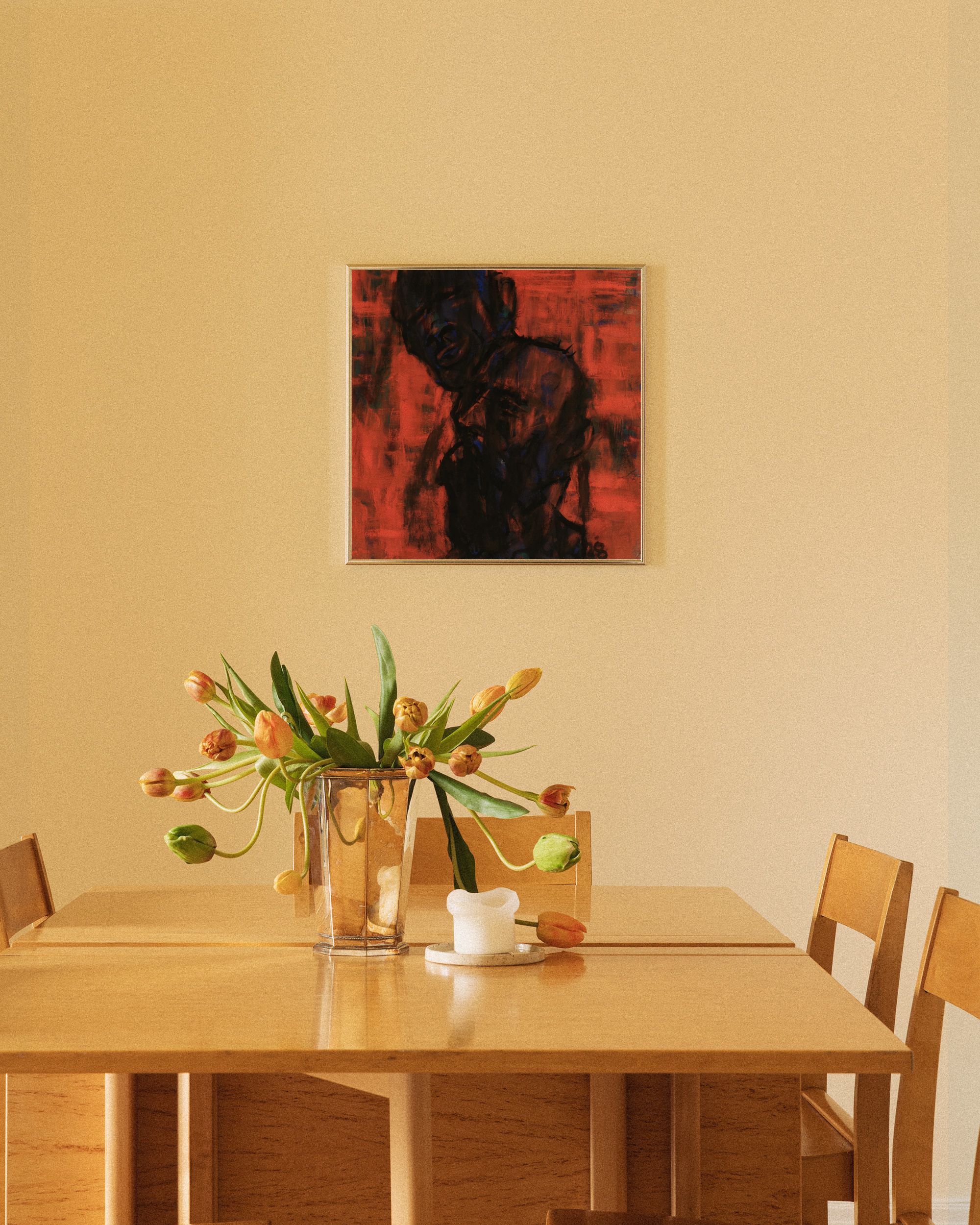 Un póster abstracto con dos rostros superpuestos en tonos oscuros de negro y azul sobre un fondo rojo anaranjado intenso. Una obra con un estilo expresivo y dramático.