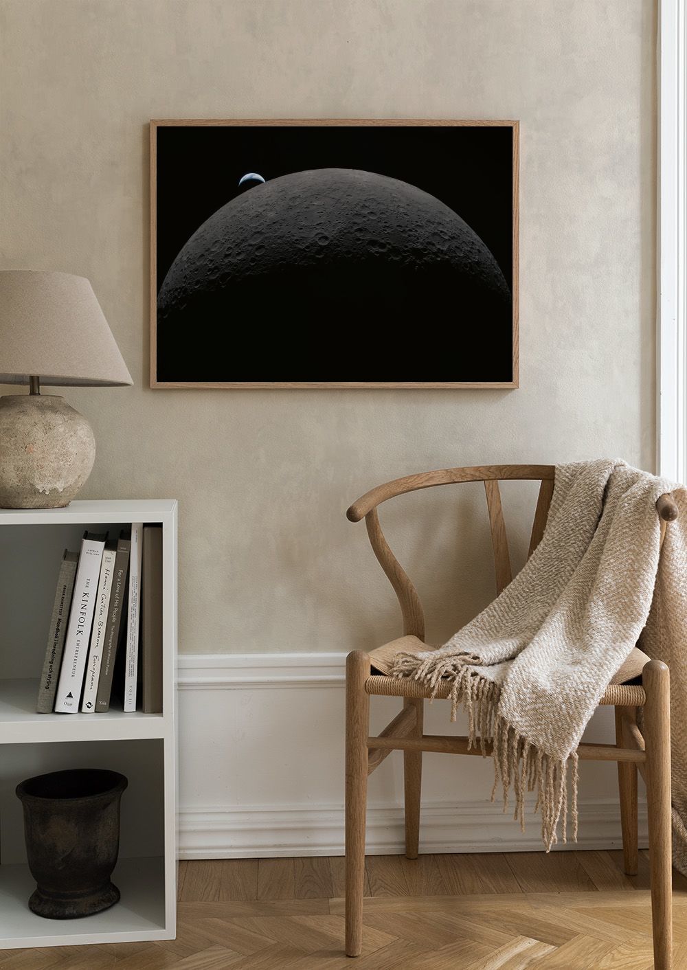 Un póster que muestra la luna con su superficie gris llena de cráteres y la Tierra en forma de media luna azul y blanca. El fondo negro crea un contraste perfecto entre estos dos cuerpos celestes.