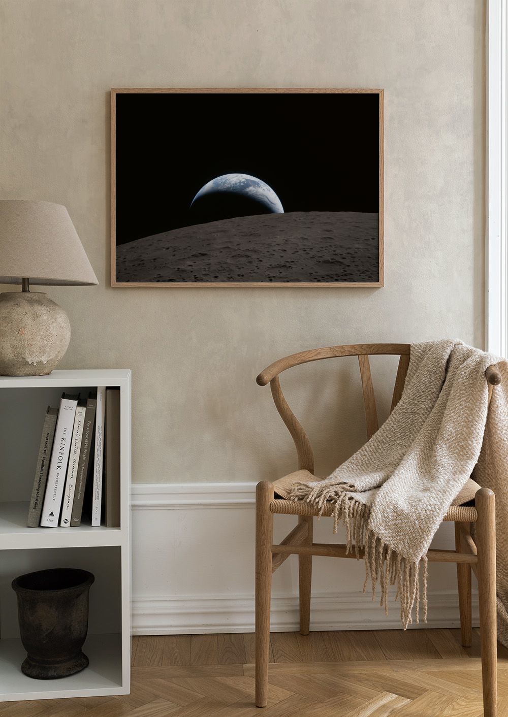 Un póster que muestra nuestro planeta Tierra desde el espacio, con sus tonos azules y blancos sobre un fondo negro. Una imagen perfecta para los amantes del espacio.