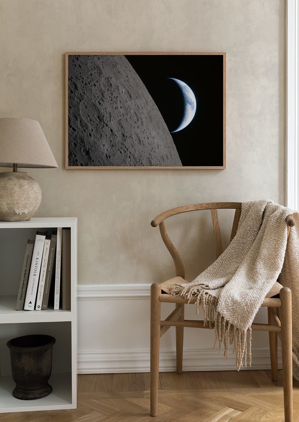 Un póster que muestra la superficie lunar con sus cráteres grises y una hermosa luna creciente en tonos blancos y azules sobre un fondo negro.